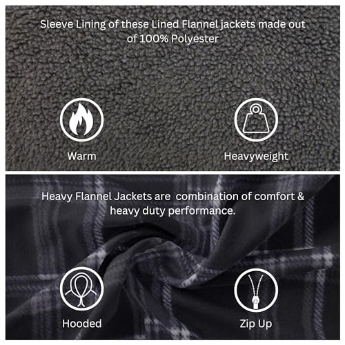 • - Zipper Fleece Lined Flannel Hoodies Jackets : Featuring the full zipper closure, 2 front button down chest pockets & 2 side slit pockets and drawstring tie cotton hood. Sleeve lining of these lined flannel jackets for men is 100% polyester. Choose from a variety of colors & prints from our range of mens plaid jacket designs. Everyone's sizes are different and visive offers a wide range size scale. Starting from medium to 5x large thick flannel jackets are available in big & tall sizes!
