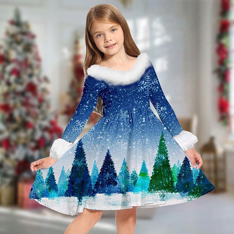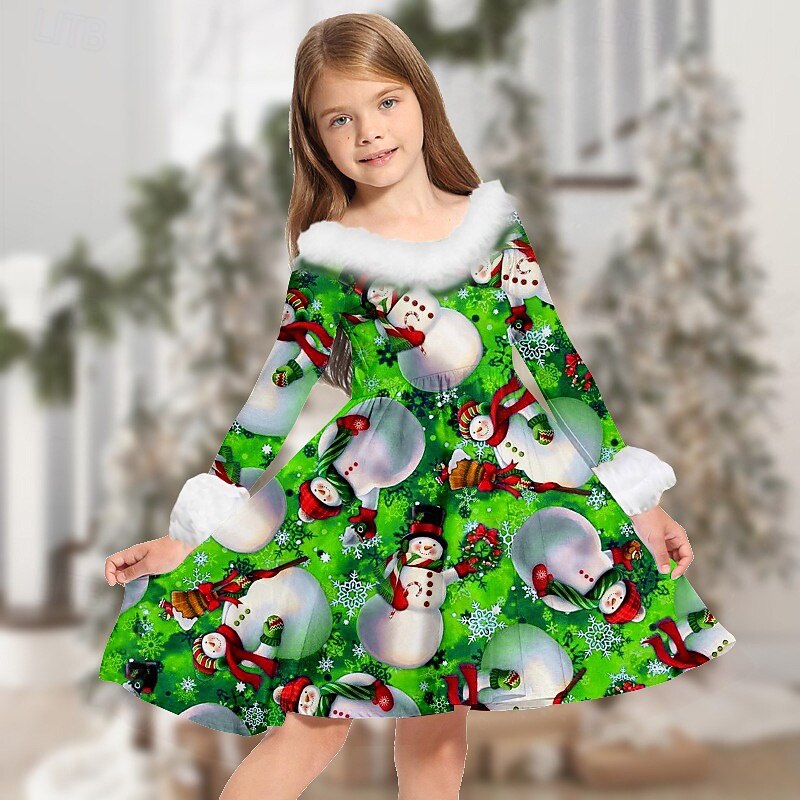 More information about Kids Girls' Christmas Dress Dress Snowflake Dress Santa Claus Elk Snowman Long Sleeve Casual Fur Trim Crewneck Elegant Adorable Polyester Above Knee Casual Dress Swing Dress A Line Dress Fall Winter