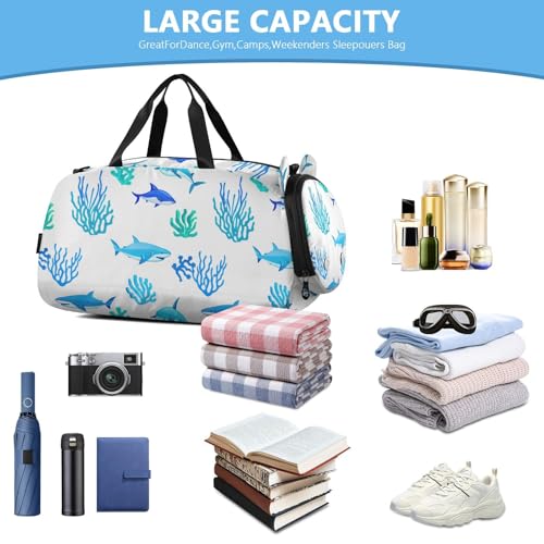 Sharks Blue Kids Travel Duffel Bag for Boys Girls Overnight Weekend Tote Bag with Shoes Compartment for Sleepover Trip Beach 6