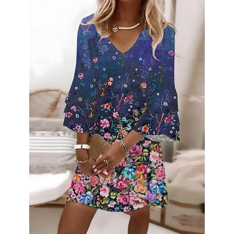 trending ! Women's Mini Dress Sundress A Line Dress Vacation Casual Boho Beach Regular Fit Ombre Floral Graphic 3/4 Length Sleeve V Neck Colourful Pink Sky Blue Ink Blue Summer Spring