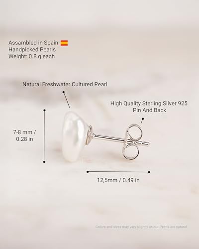 • PEARL DETAILS AND SIZES | Origin: Freshwater Cultured Pearls | Shape: Keshi | Brightness: Intense, it's the most important quality | Color: White | Surface: Clean | Size: 7-8 mm, 8-9 mm, 9-10 mm, 10-11 mm, 11-12 mm, 12-13 mm, 13-14 mm, 14-15 mm and 15-16 mm. First 4 sices come with 6 mm backs and the others with 9 mm for much better support. See photo with measurements. The model is also using the correct size in each photo.