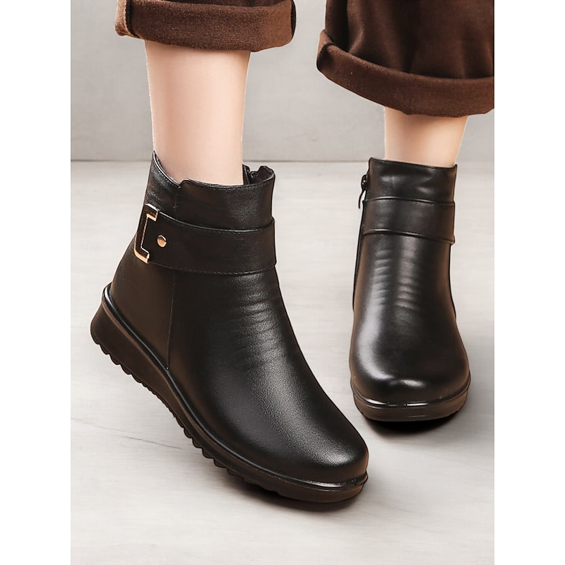 Women's Faux Leather Ankle Boots with Faux Fur Lining – comfortable, Slip-Resistant Winter Footwear with Buckle Detail