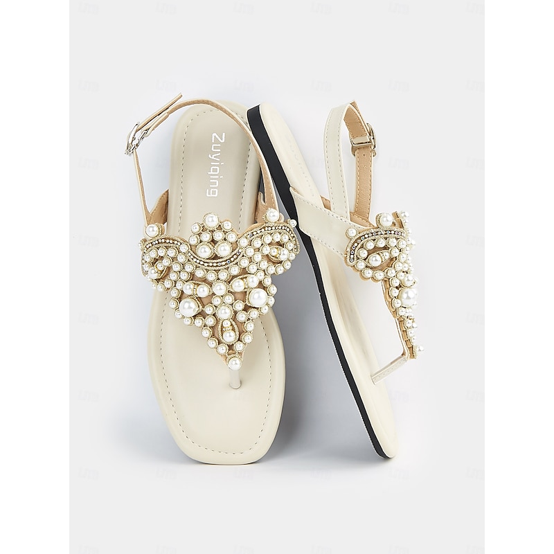 More information about Women's Pearl-Embellished T-Strap Flat Sandals – Elegant Open-Toe Wedding Shoes for Brides and Beach Weddings