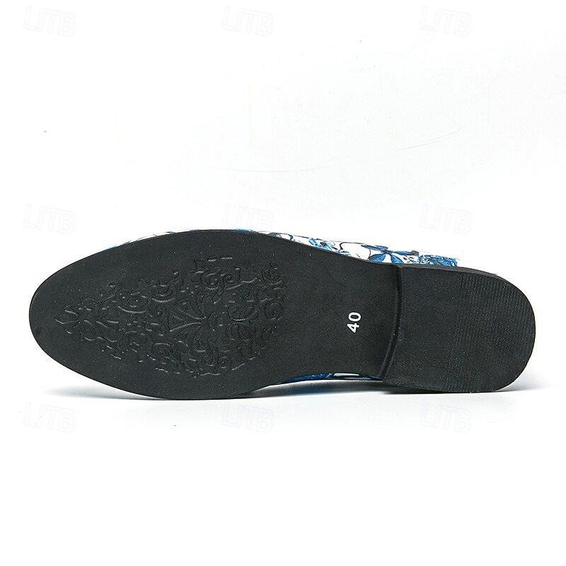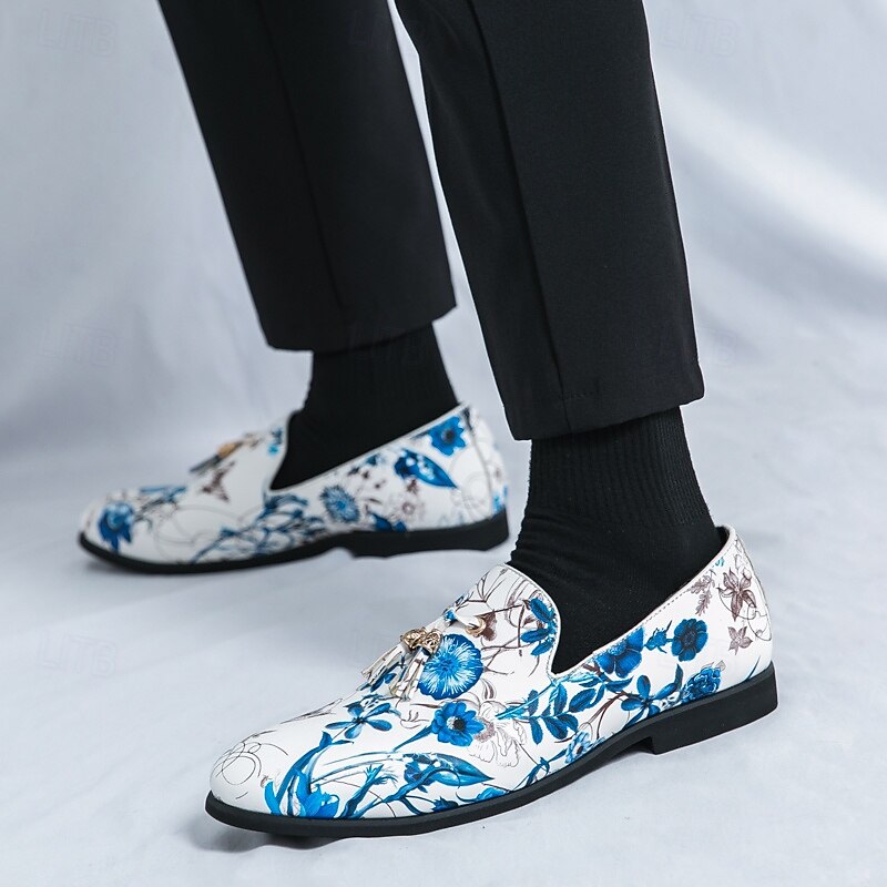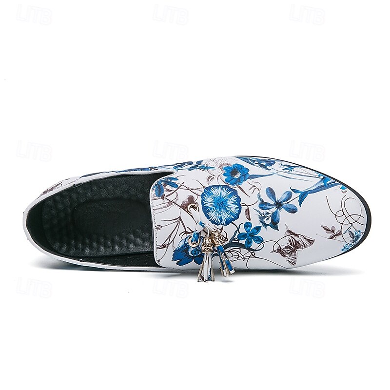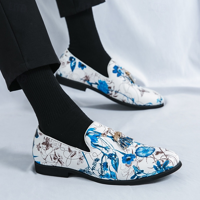 Highlights [Fabric] : Crafted from premium PU leather, these men's loafers offer a blend of durability and a refined look. The PU leather lining enhances comfort and wearability, while ensuring the shoes are breathable and slip-resistant for everyday use. [Fit] : Designed with a classic slip-on silhouette, these loafers feature a round toe shape that provides ample room and comfort. The low heel design ensures ease of walking and adds to the overall comfort of the shoe. [Design Highlights] : Featuring a striking floral print in vibrant blue hues on a white background, these loafers make a bold fashion statement. The elegant tassel detail adds a touch of vintage sophistication, and the sturdy black rubber sole offers dependable grip and support. [Occasions] : Perfect for both casual and formal settings, these loafers are versatile enough for a range of occasions – from a night out at a formal dinner to a relaxed weekend gathering. They effortlessly balance style and comfort, making them suitable for numerous fall and winter events. [Size Range] : Available in a variety of sizes to ensure the perfect fit – from US7/EU39/UK6 to US11/EU44/UK10. These loafers are designed to accommodate different foot sizes comfortably.