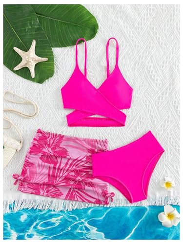 SHENHE Girl's 3 Piece Swimsuits Wrap Criss Cross High Waisted Bikini Set with Cover Up Skirt 3