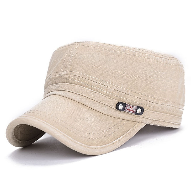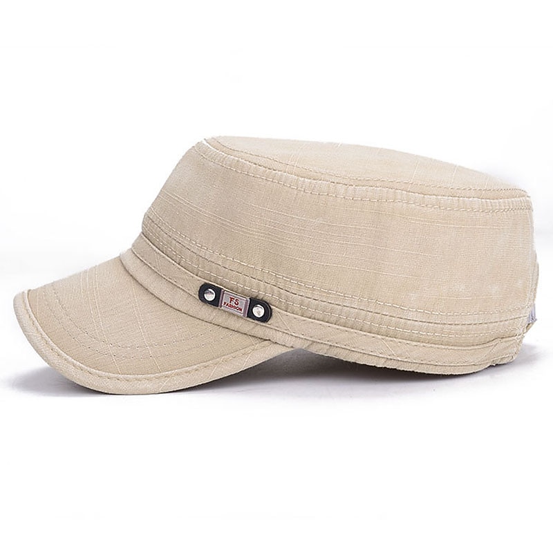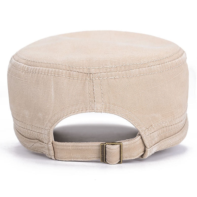 Highlights [Fabric] Crafted from a durable cotton blend, this men's cap offers both comfort and breathability, making it a perfect choice for a variety of weather conditions. The fabric's subtle textured finish adds sophistication to its classic design. [Fit] The cap features a flat top and a structured bill, inspired by classic military aesthetics. Its adjustable back strap ensures a secure and customized fit for head sizes ranging from 55-60cm. [Design Highlights] This cap is available in multiple stylish colors, including black, green, blue, coffee, and khaki. Each color option is embellished with a small decorative metal label and rivets on the front, accentuating its vintage appeal. The minimalist design offers a timeless yet modern look. [Occasions] Ideal for beach trips, travel adventures, and outdoor vacations, this versatile cap complements casual outings and everyday wear. Its vintage design adapts effortlessly from relaxed days to more active outdoor adventures. [Size Range] The cap is available in a one-size-fits-all range, adjustable to fit head sizes from 55-60cm, ensuring versatility and comfort for various individuals.