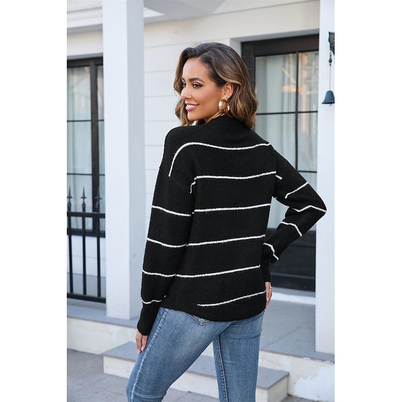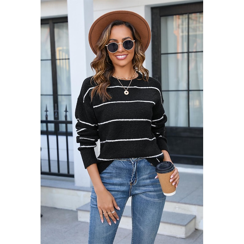 trending ! Women's Sweater trendy Basic Striped Ribbed Crew Neck Stripe Long Sleeve Long Tops Knit Work Black White Spring Fall