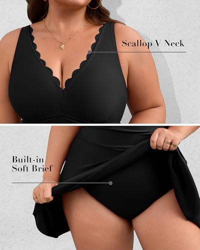 • Plus Size Swimsuit Feature: Plus size swimdress for women designed scallops trim the v neck,The ruching on waist provides excellent tummy control