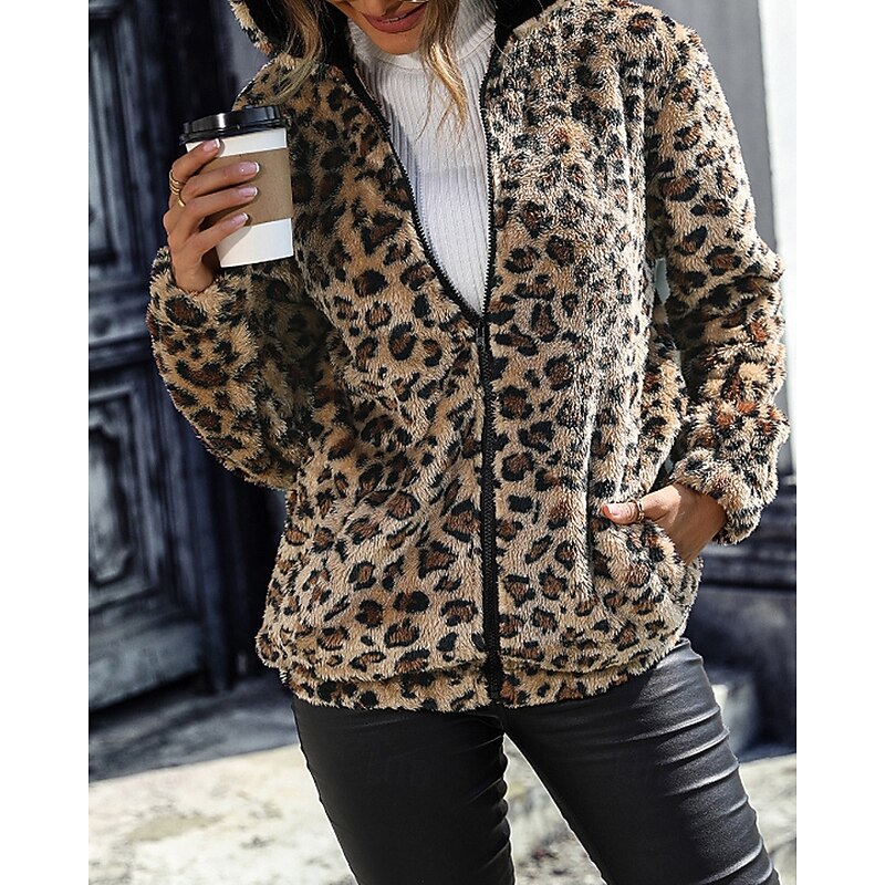Women's Teddy Coat Hoodie Jacket Warm Comfortable Zipper Pocket Casual Leopard Vacation Casual Daily Wear Going out Regular Hooded Regular Fit Long Sleeve Outerwear Coffee Fall Winter 8