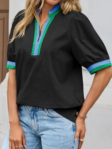 Tankaneo Womens Color Block Puff Sleeve Tops Dressy Casual V Neck Cotton Blouses Summer Loose Fit Tees Shirts 3