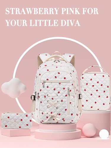 Cute Strawberry Print Backpack with Lunch Box and Pencil Case for Girls Teens Kids for Age 8-10 10-12 12-14 Kawaii Backpack for Elementary Middle High School Bookbag Mochila Para Niñas 6