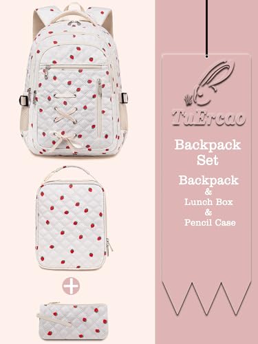 HOT ! Cute Strawberry Print Backpack with Lunch Box and Pencil Case for Girls Teens Kids for Age 8-10 10-12 12-14 Kawaii Backpack for Elementary Middle High School Bookbag Mochila Para Niñas