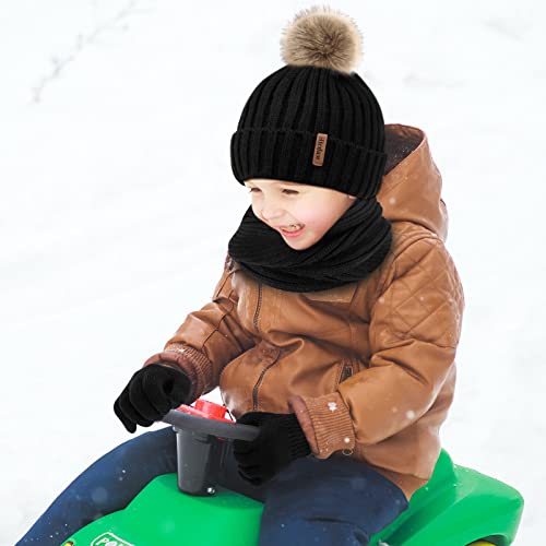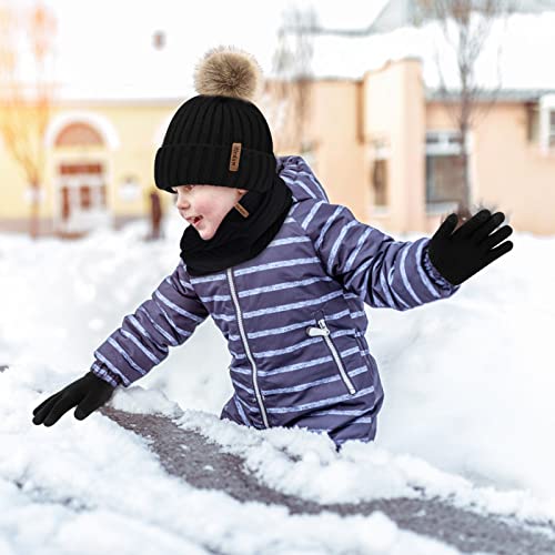 Hicdaw Kids Winter Hats Gloves Scarf Set Touchscreen Glove With Removable Pompom Fleece Lined Toddler Beanie Hat for Boy Girl 4