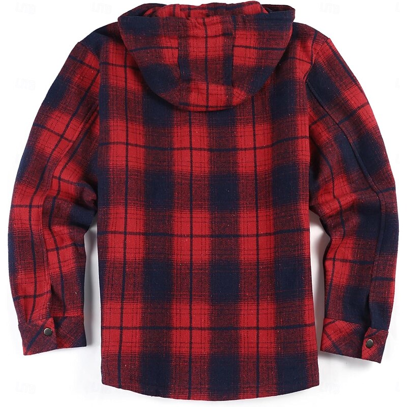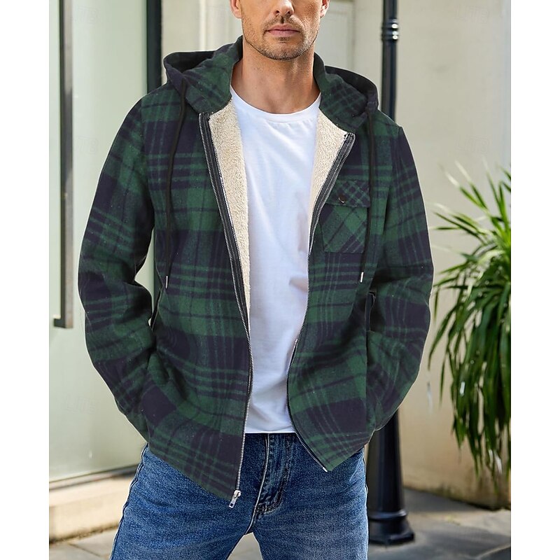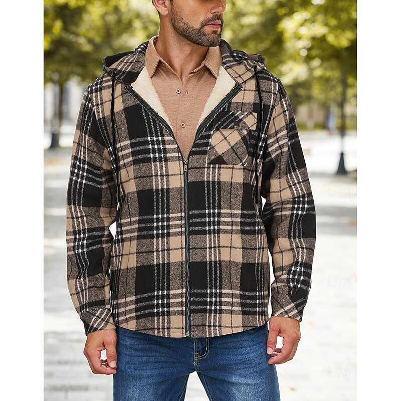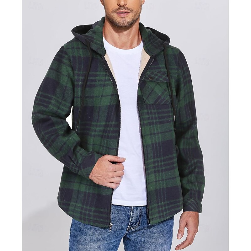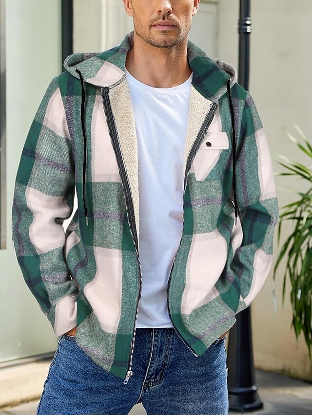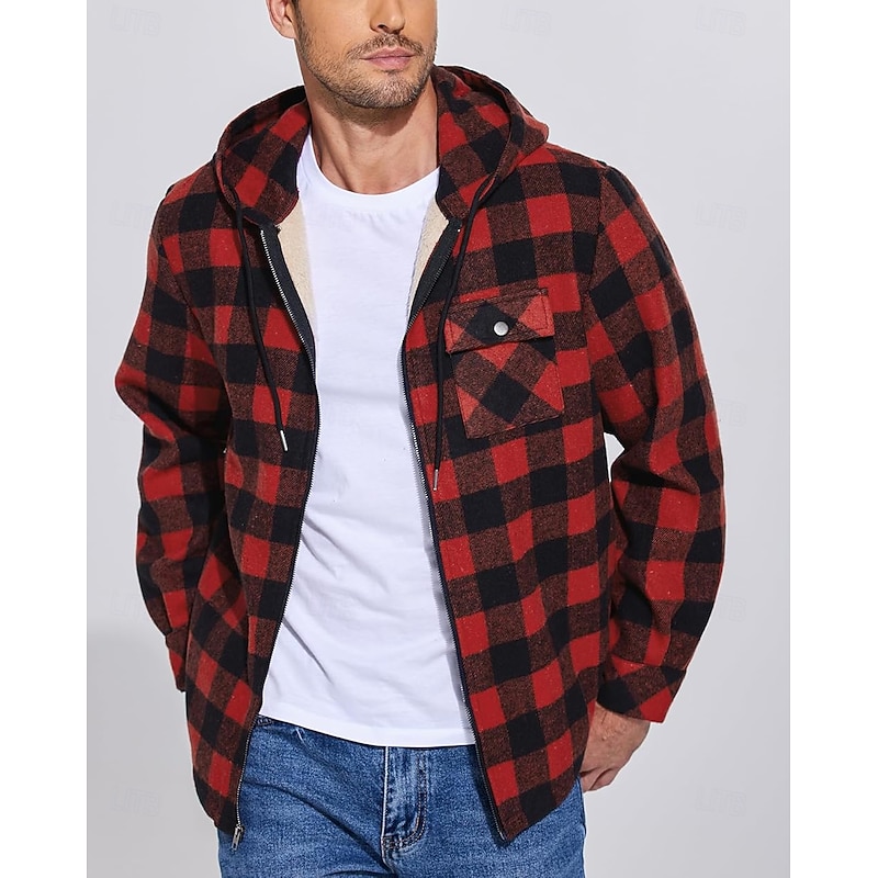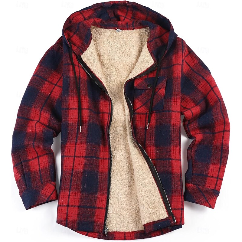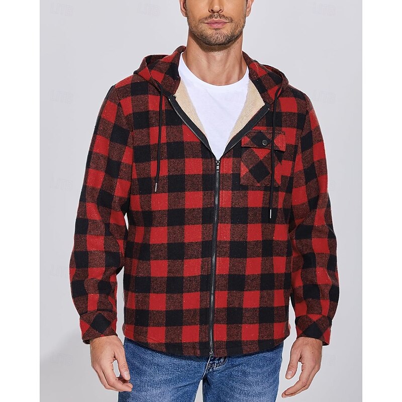 More information about Men's Shirt Jacket Hoodied Jacket Shacket Flannel Fleece Jacket Daily Vacation Thermal Warm Hooded Fall & Winter Plaid Checkered Fashion Streetwear Lapel Regular Black Dark Red Light Green Red Blue
