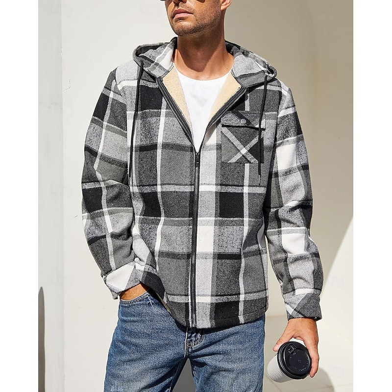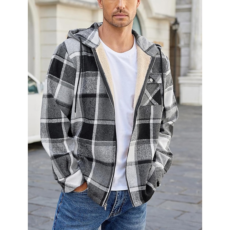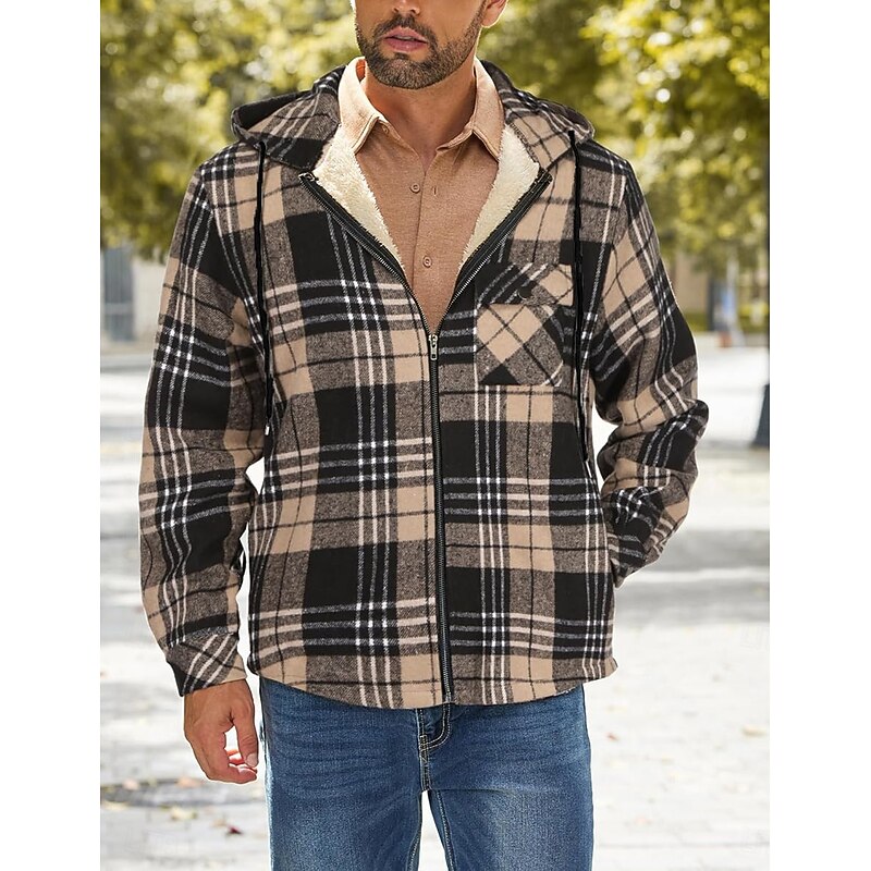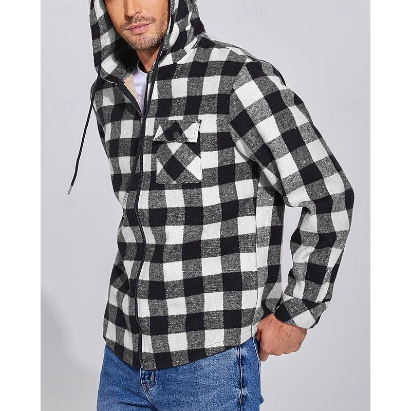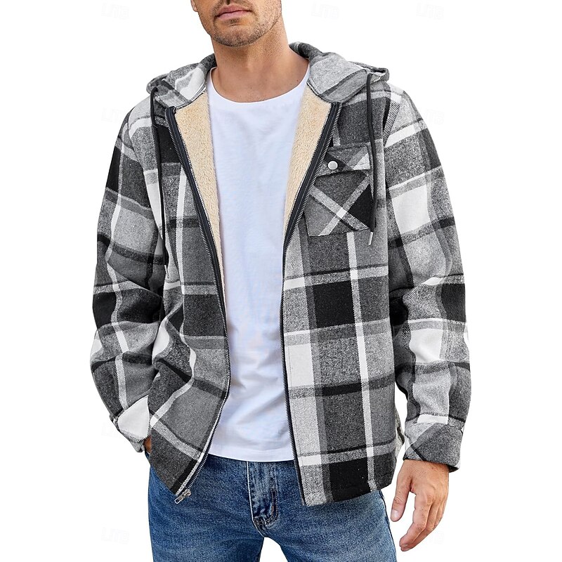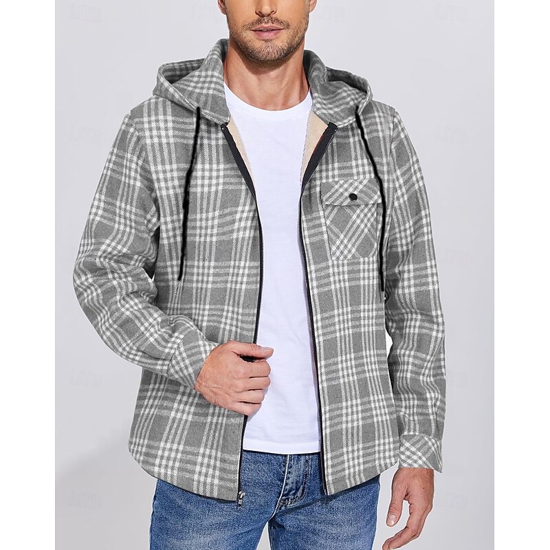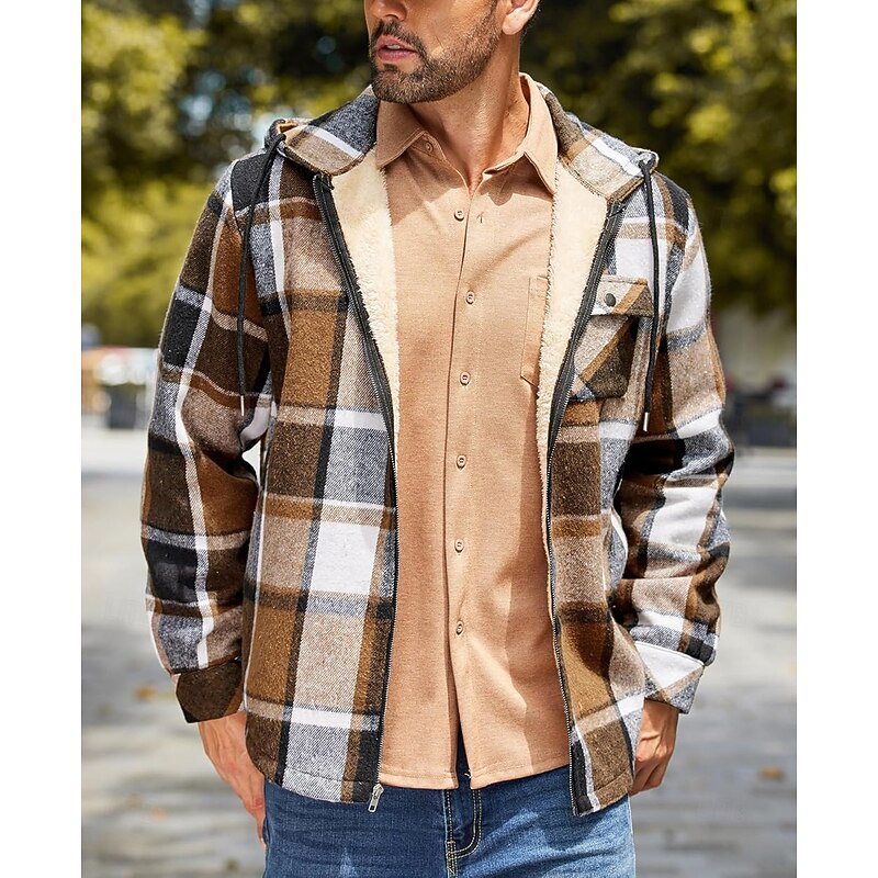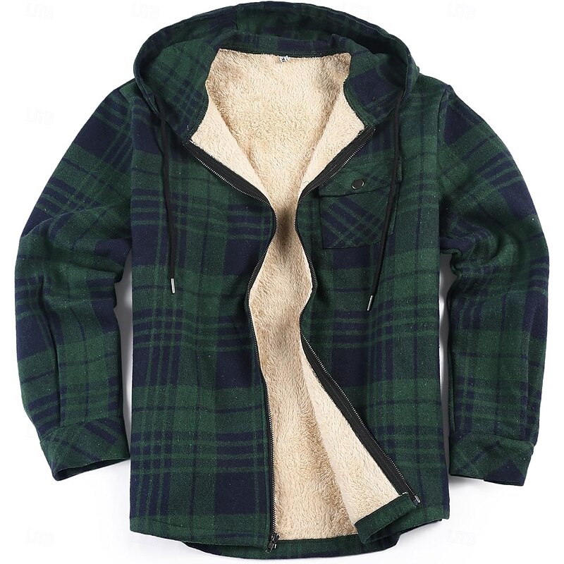 More information about Men's Shirt Jacket Hoodied Jacket Shacket Flannel Fleece Jacket Daily Vacation Thermal Warm Hooded Fall & Winter Plaid Checkered Fashion Streetwear Lapel Regular Black Dark Red Light Green Red Blue