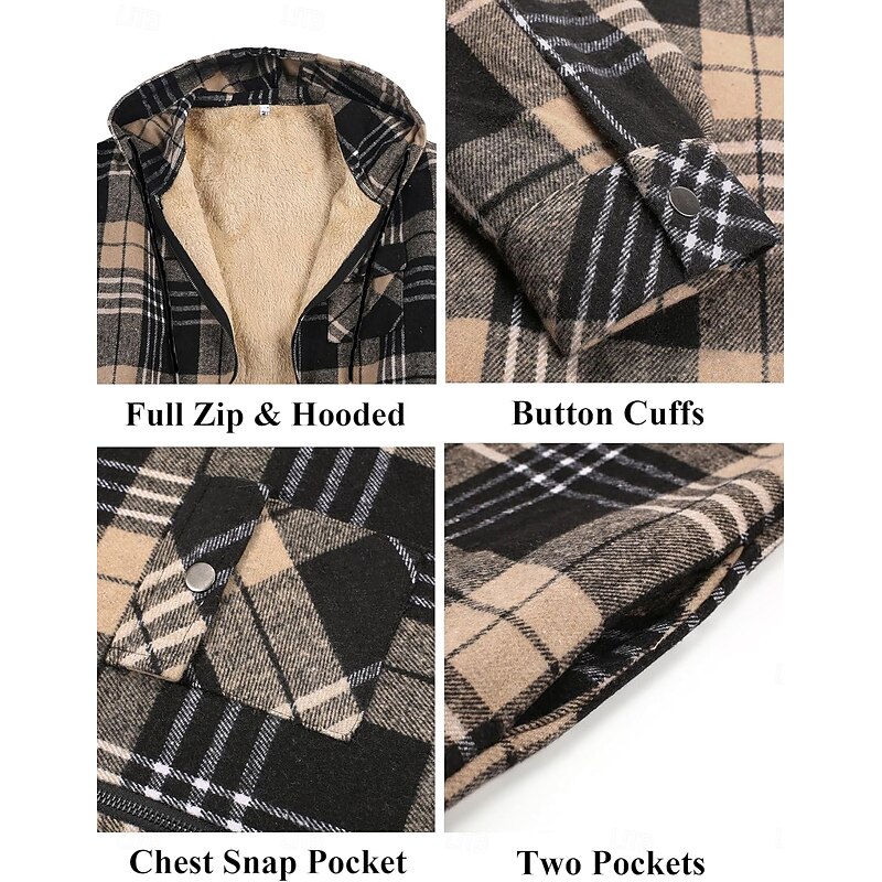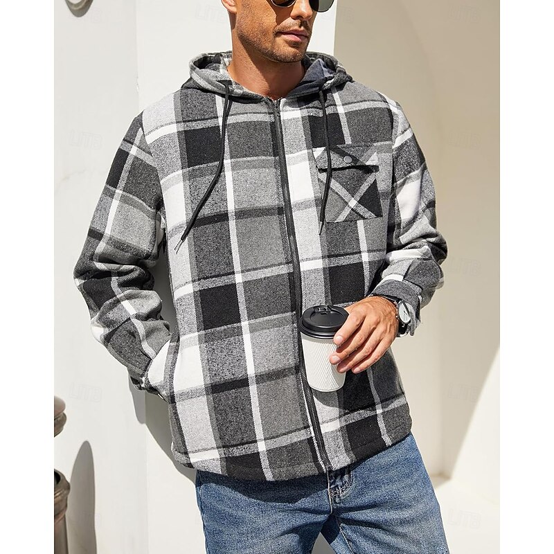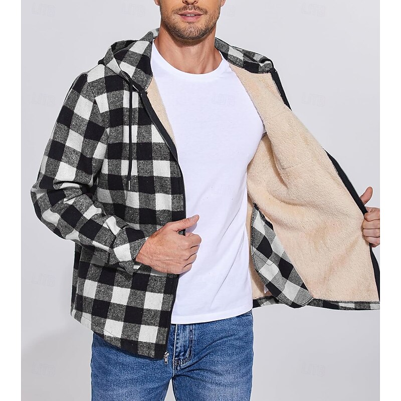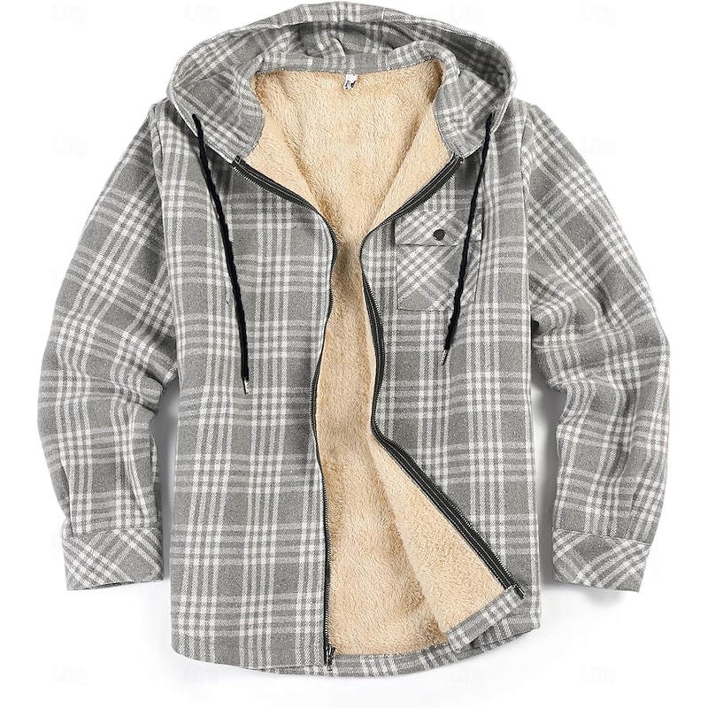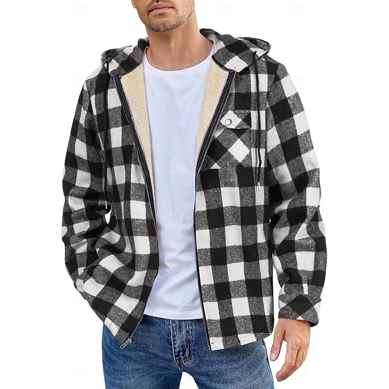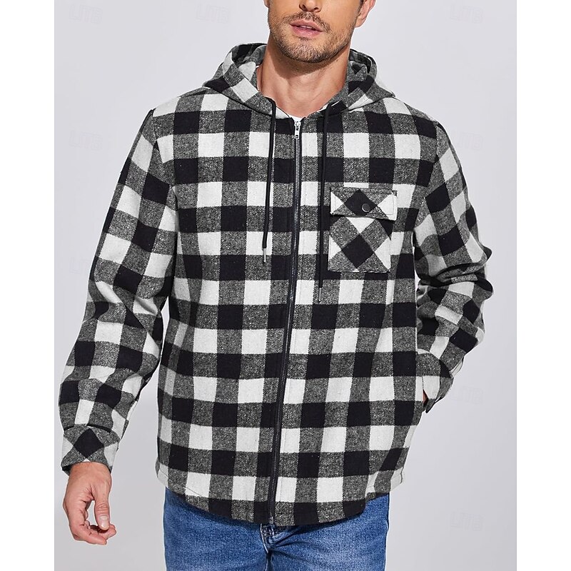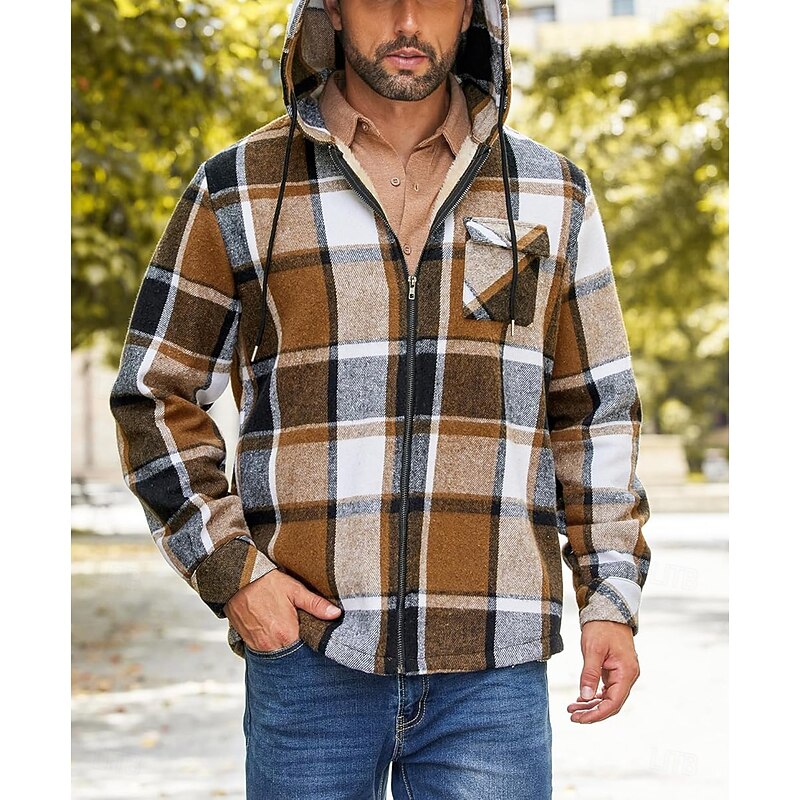 More information about Men's Shirt Jacket Hoodied Jacket Shacket Flannel Fleece Jacket Daily Vacation Thermal Warm Hooded Fall & Winter Plaid Checkered Fashion Streetwear Lapel Regular Black Dark Red Light Green Red Blue