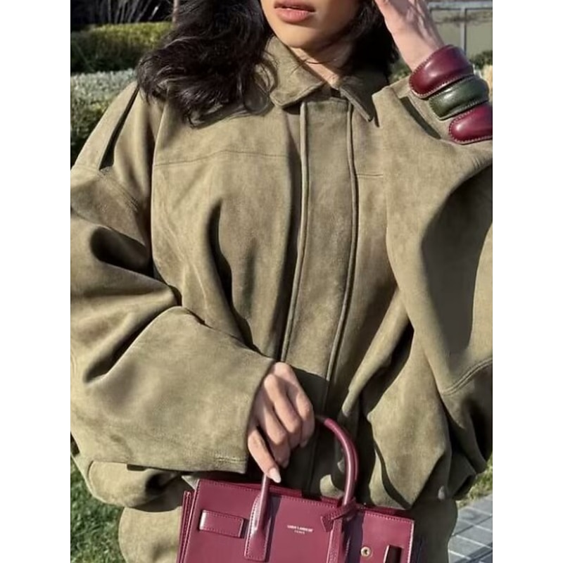Women's Casual Jacket Comfortable Breathable Zipper Casual Plain Vacation Street Casual Daily Wear Zipper Short Turndown Loose Fit Long Sleeve Outerwear Black Red Brown Spring Fall 1