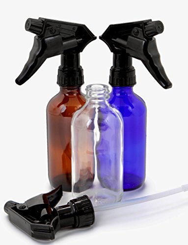 • 6 - 8 oz, Assorted Colors (Clear, Amber, Cobalt Blue) glass bottles, with black trigger sprayers.