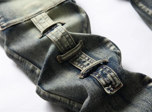 Men's Vintage Ripped Jeans (Without Belt) Patchwork Straight Leg Skinny Fit Biker Denim Pants 6