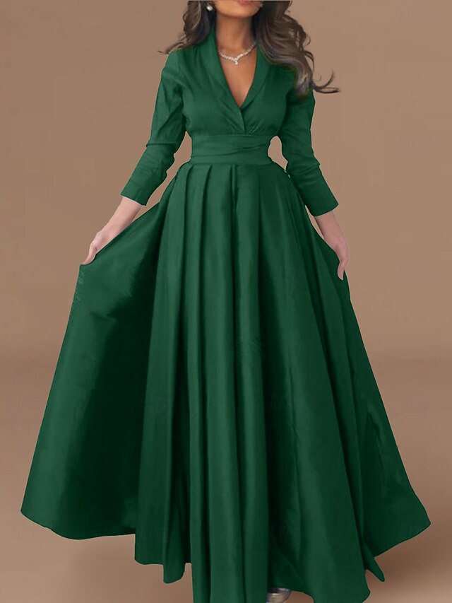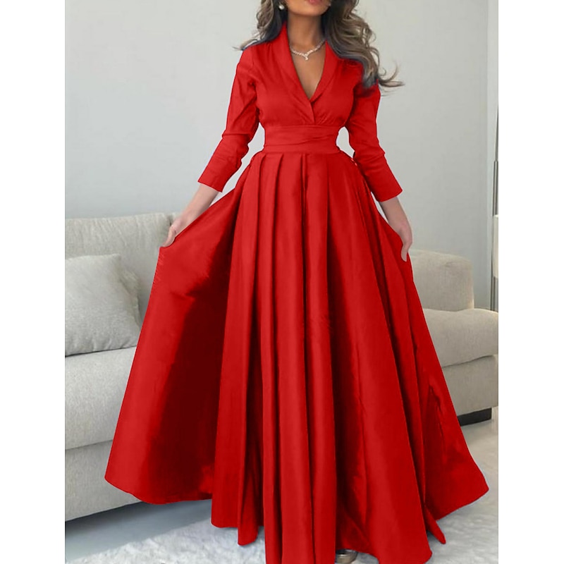 trending ! Satin A-Line Chrismas Dress Evening Gown Elegant Dress FormalRed Dress Floor Length 3/4 Length Sleeve V Neck with Pleats dress to impress