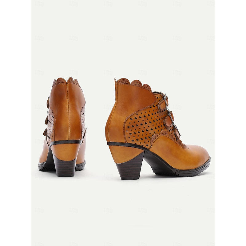 HOT ! Women's Vintage Buckle Strap Ankle Boots - Brown Perforated High Heels for Oktoberfest, Casual, and Formal Wear