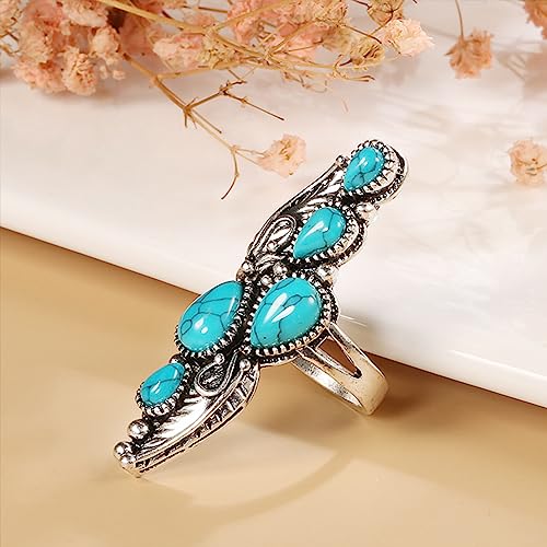 HAIXIAN Antique Full Finger Turquoise Stones Ring,Retro Thick Silver Plated Multi Waterdrop Gemstone Crystal Wide Cocktail Party Ring Jewelry 5