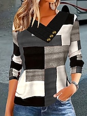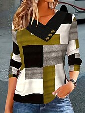 More information about Women's T Shirt Graphic Geometric Color Block Vintage Stylish Classic Long Sleeve V Neck Regular Tops Daily Buttons Print Asymmetrical Grass Green Black and gray Wine Fall Winter