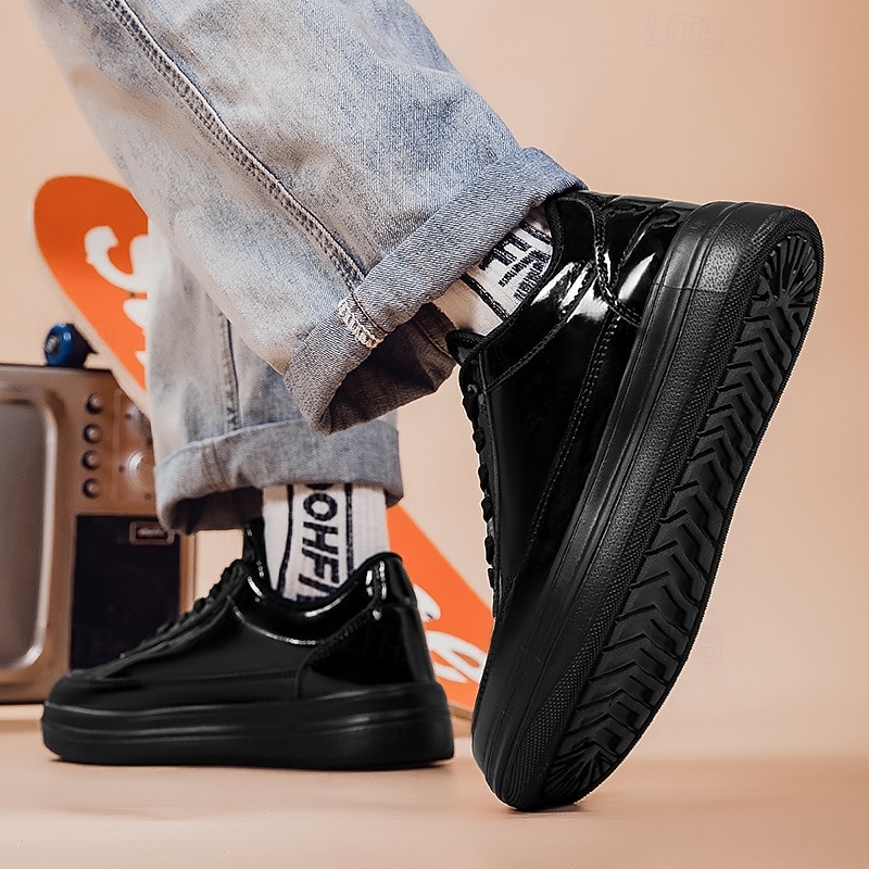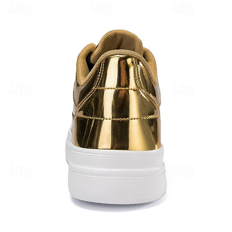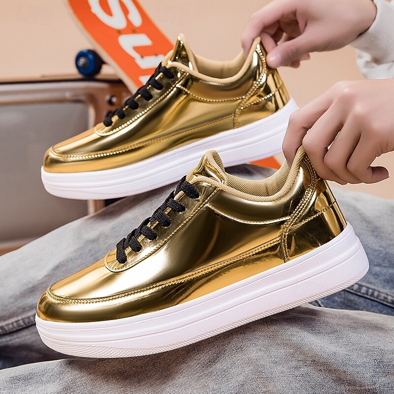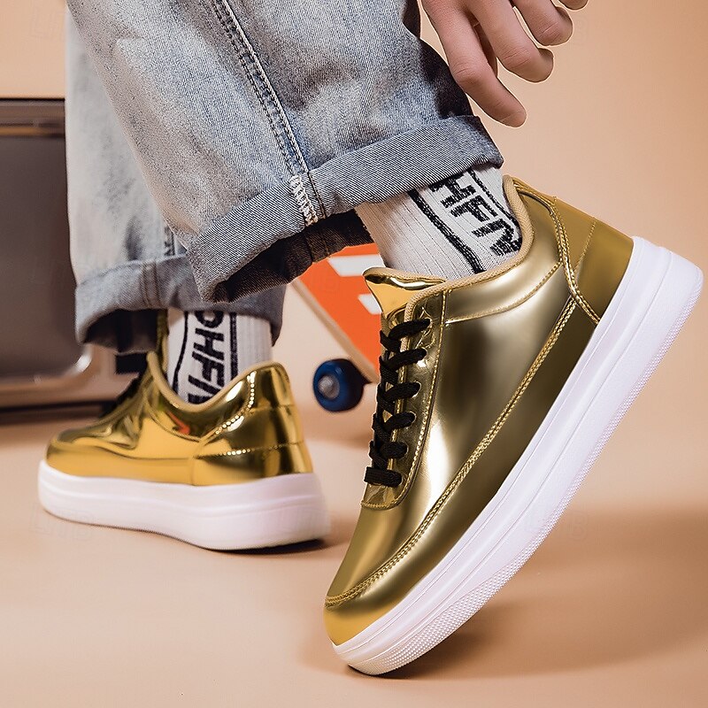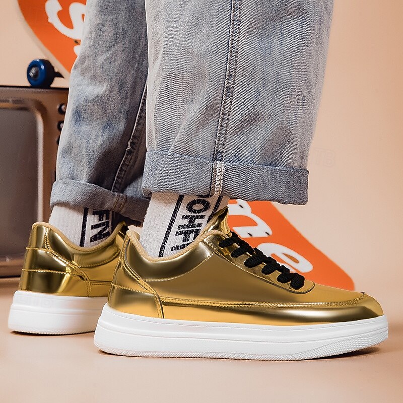: Crafted from high-quality PU leather, these men's sneakers boast a gleaming metallic gold finish that emulates the look of polished metal, ensuring both durability and style. The lining is made of soft PU, providing comfort for extended wear.