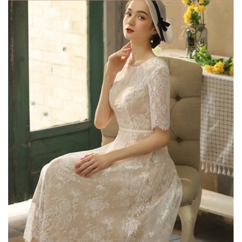 Highlights [Fabric:] Crafted from exquisite lace fabric, this dress features a soft, lightweight lining that guarantees both comfort and elegance. The lace overlay comes in a charming beige tone, adding a romantic and timeless quality to the overall design. [Silhouette:] The dress boasts a classic A-line silhouette that elegantly falls to tea length, enhancing the wearer's figure with a chic and sophisticated appeal. [Design Highlights:] With its illusion neckline and half sleeves, this dress showcases intricate appliques and a stylish sash or ribbon that add to its vintage charm. The thoughtful inclusion of a built-in bra ensures a perfect fit, while the zipper closure provides ease of wear. [Occasions:] Suitable for a variety of events, from wedding receptions and bridal showers to more formal gatherings. Its romantic and vintage theme makes it a versatile choice for any special occasion. [Size Range:] Available in a wide range of sizes, from US size 0 to 26W, and also offers custom measurements to ensure the perfect fit for every individual.