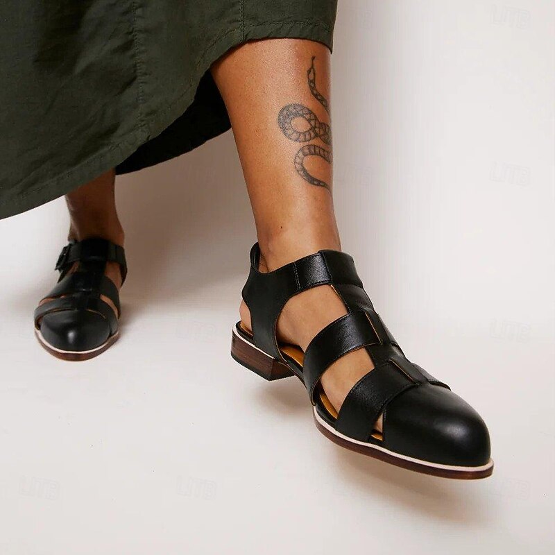 HOT ! Women's Brown Faux Leather Fisherman Sandals – Vintage Closed-Toe Buckle Flats for Summer, Travel & Casual Outfits