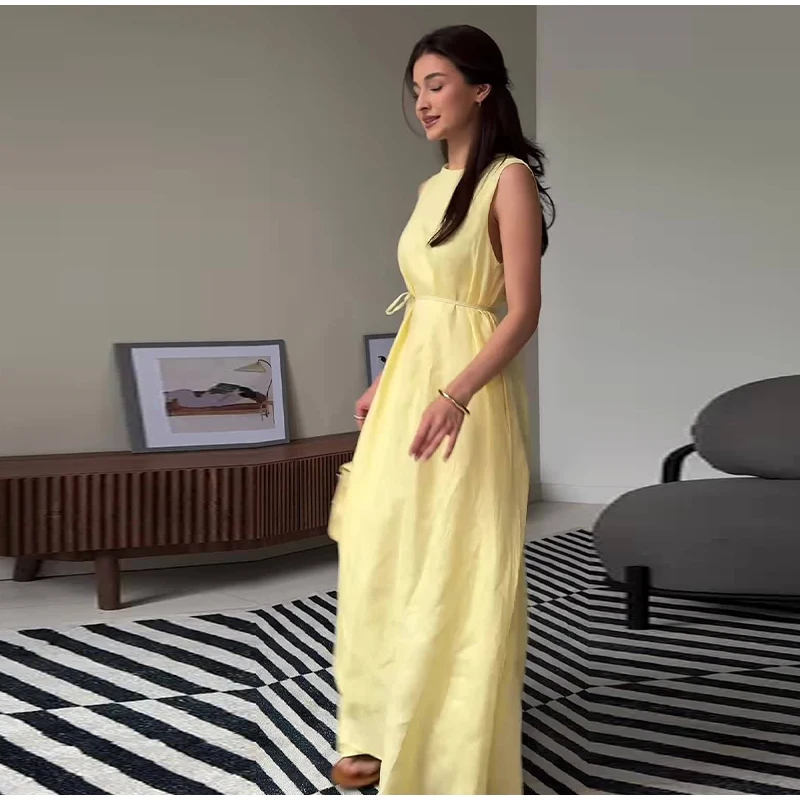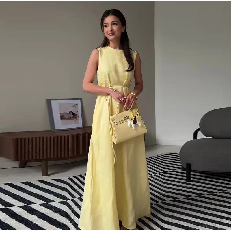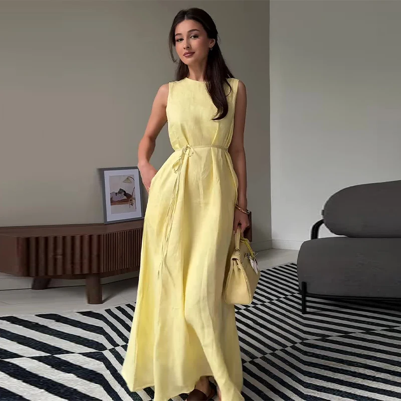Breathable Yellow Lace Up Women's Dresses Sleeveless High Waist A-line Long Dress for Casual Chic Office Wear