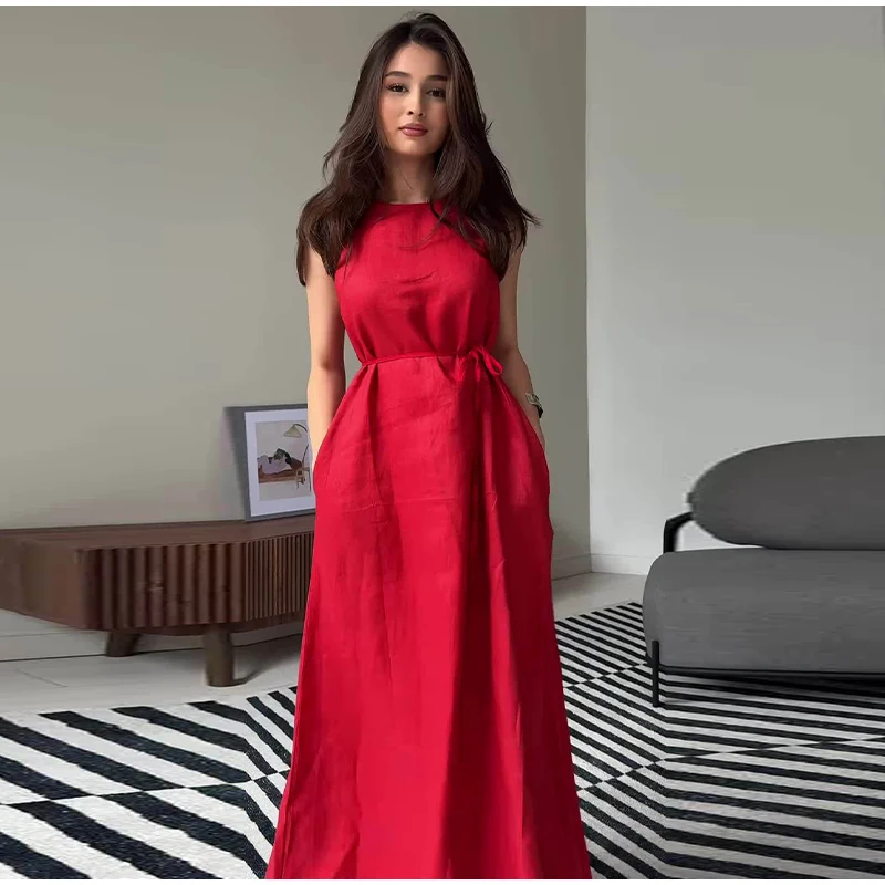 SPECIFICATIONSAge: Middle AgeBrand Name: Chin.SweetyCN: ZhejiangClosure Type: PulloverCraft of Weaving: Non-WovenDecoration: NoneDresses Length: Mid-CalfElasticity: Slight StrechFabric Type: POLYESTERFit Type: SlimGender: WomenHign-concerned Chemical: NoneMaterial: Cotton,POLYESTERMaterial Composition: Natural FiberNeckline: Sweetheart NeckOrigin: Mainland ChinaPattern Type: SolidPlace Of Origin: China (mainland)Profile Type: ARelease Date: Summer 2025Season: SummerSilhouette: SheathSleeve Length(cm): SleevelessSleeve Style: RegularStyle: Office LadyType: RegularWaistline: Elastic Waist1.Elegant Sleeveless Maxi Dress:Features a sleek sleeveless design and a high - waist tie - up detail. This dress creates a graceful silhouette, perfect for formal events, garden parties, or summer weddings.2. Breathable Linen - Like Fabric:Made from lightweight, breathable fabric with a linen - like texture. It keeps you cool and comfortable in warm weather, while offering a natural and relaxed aesthetic.3. Flattering High - Waist Tie Design:The waist tie allows for a customizable fit, accentuating your waist and creating an hourglass shape. It adds a feminine touch to the dress, enhancing its overall elegance.4. Versatile Solid Color & Style:The bright yellow solid color is eye - catching and versatile. You can dress it up with heels and a clutch for a sophisticated look or pair it with sandals for a more casual, laid - back vibe.5. Practical Pocket Details:Comes with convenient side pockets, adding functionality to the stylish design. Perfect for carrying small essentials like keys or a lipstick, making it both fashionable and practical.SizeBustWaistHipS886898M9272102L9676106