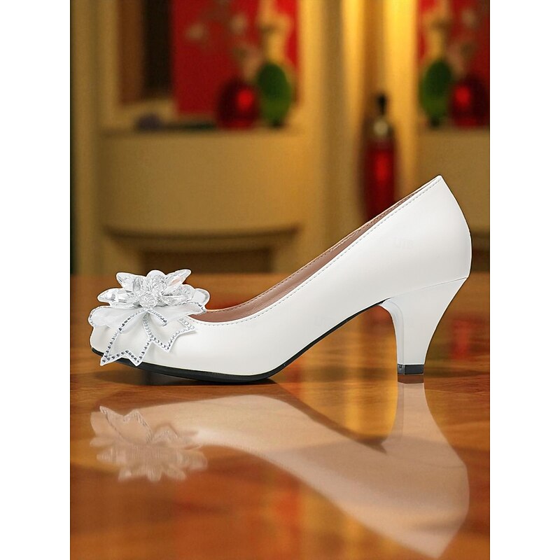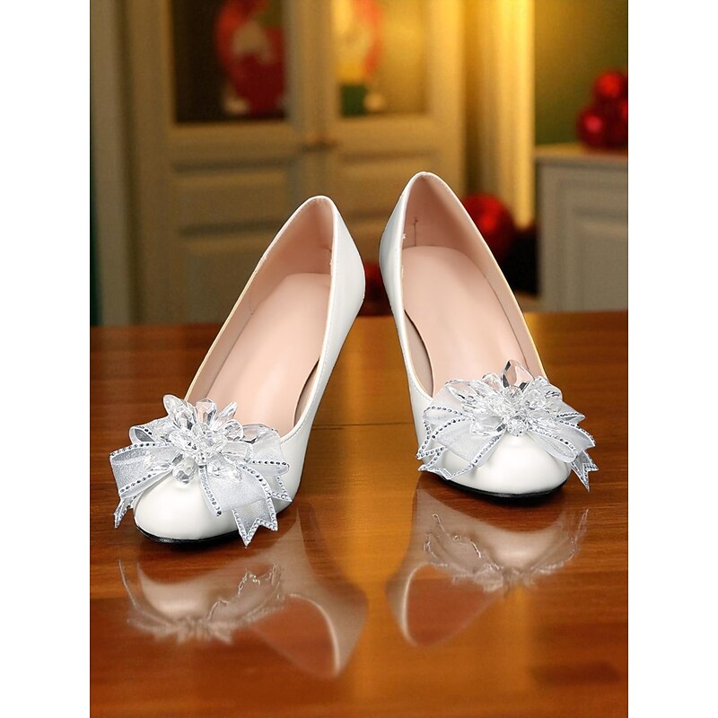 Women's White Low Heel Wedding Shoes with Crystal Bow Embellishments, Elegant Bridal Pumps for Bride and Bridesmaids 1