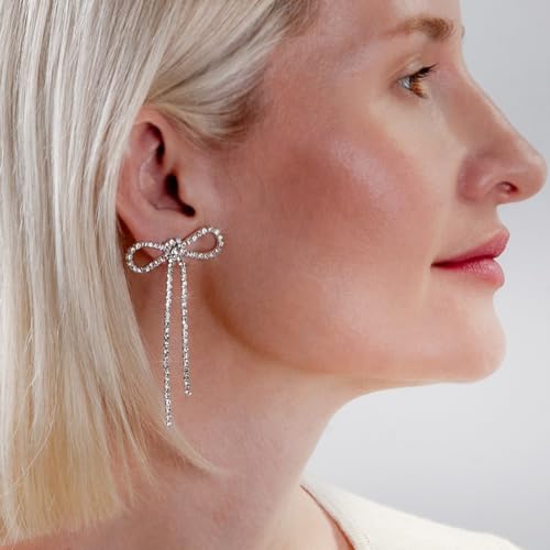• STYLISH DESIGN - These simulated diamond long bow earrings are set with a dainty cluster of pave CZ rhinestones. Trendy yet minimal, these cute ribbon studs with sparkly tassels are a jewelry-box essential. These simple drop earrings are ideal for adding a little sparkle to your wedding, bridal, or everyday style.