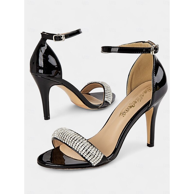Highlights - Luxurious patent leather upper material - Stunning rhinestone embellishments - Elegant open toe design - Durable rubber outsole for long-lasting wear