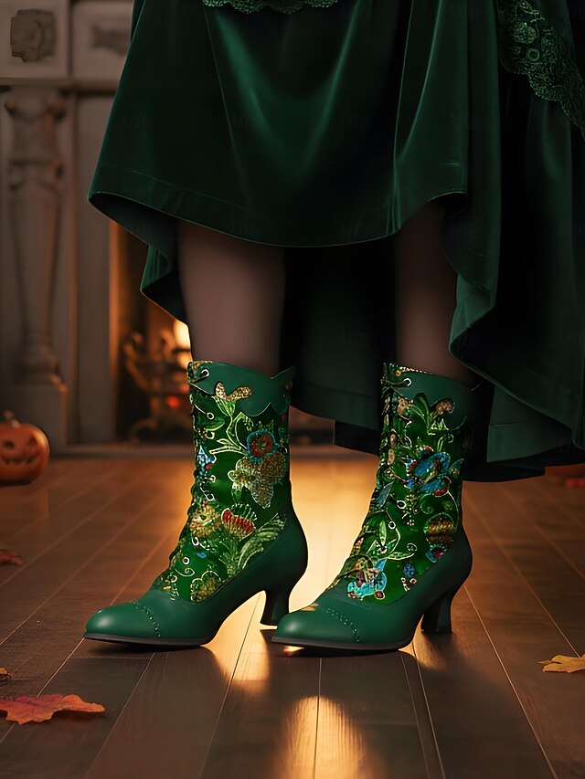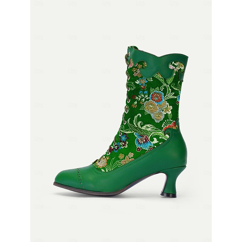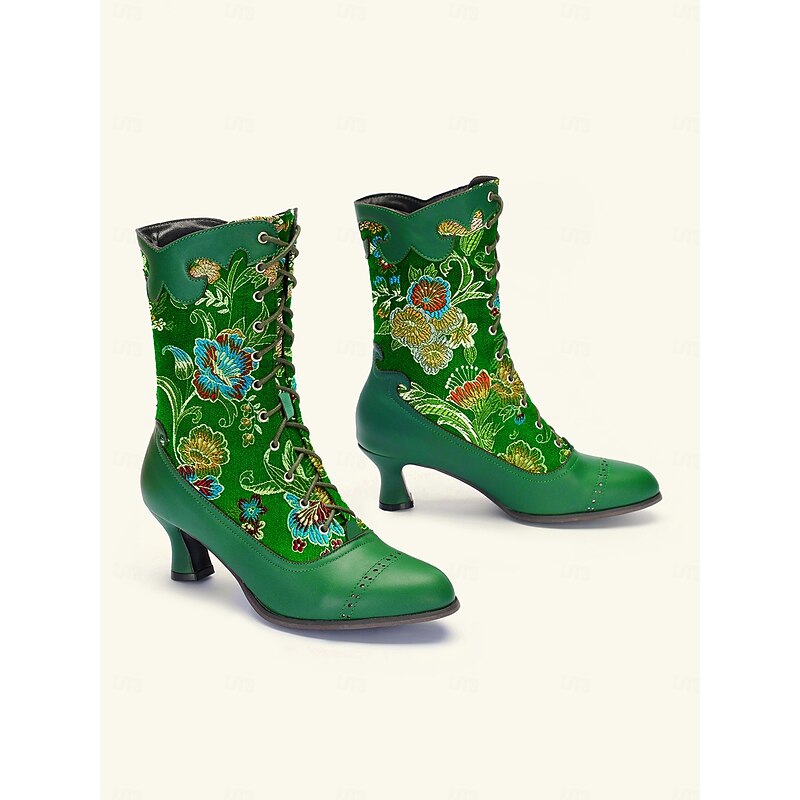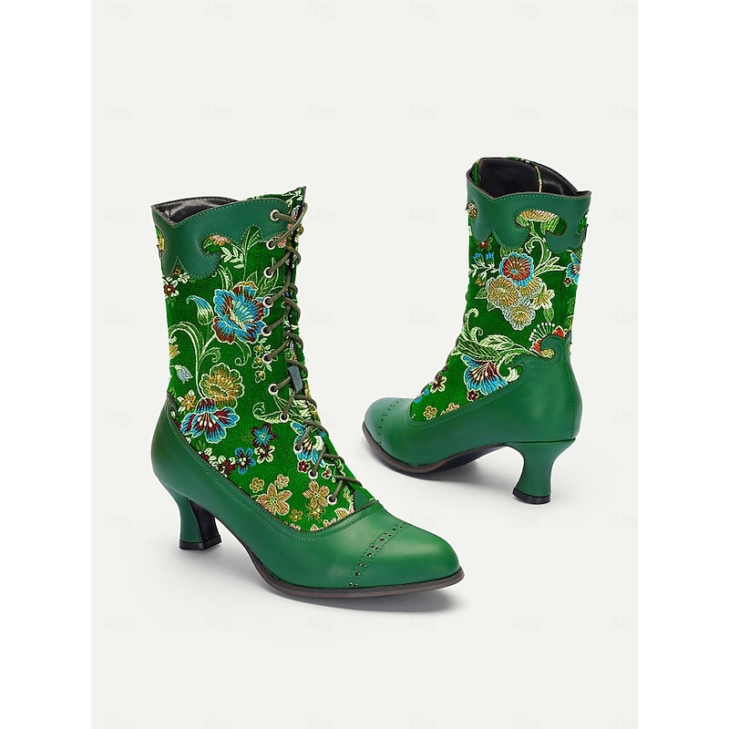 HOT ! Women's Victorian Green Floral Lace-Up Boots with Kitten Heels - 19th Century Inspired Retro Footwear for Vintage Fashion, Edwardian Performances and Costume Events