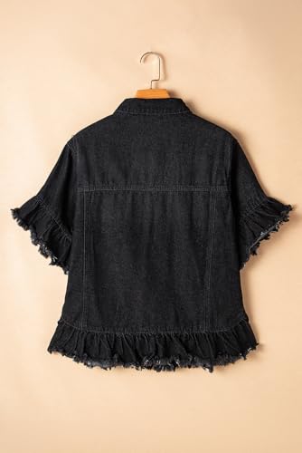KevaMolly Womens Denim Jacket Short Sleeve Peacock Ruffled Denim Jacket Pocket Raw Hem Button Casual Daily Coat 7
