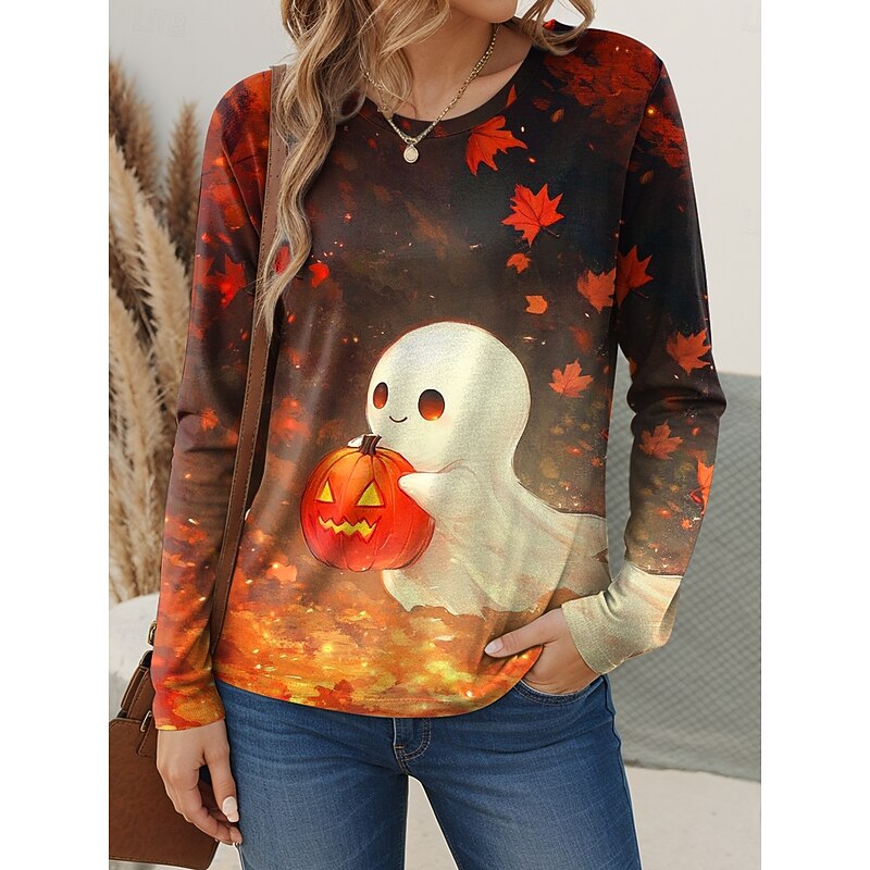 More information about Halloween Women's T shirt Pumpkin Long Sleeve Crew Neck Long Sleeve Tunic Graphic Vintage Stylish Classic Regular Tops Daily Weekend Print Black Red Fuchsia Orange Spring Fall Prefall