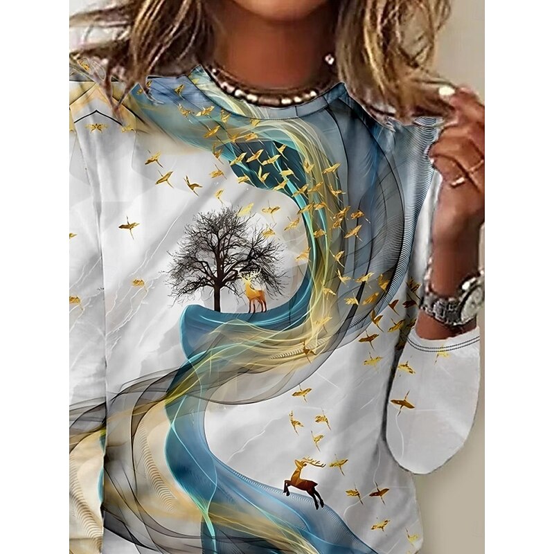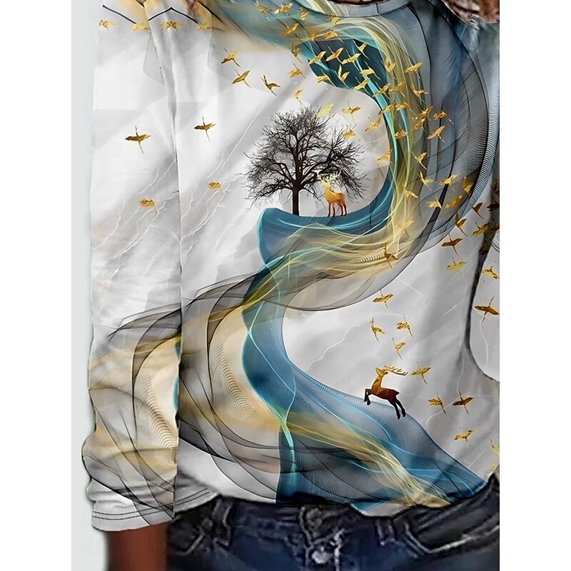Women's T shirt Crew Neck Long Sleeve Tunic Floral Scenery Elegant Vintage  Regular Tops Daily Going out Weekend Print White Gray 7