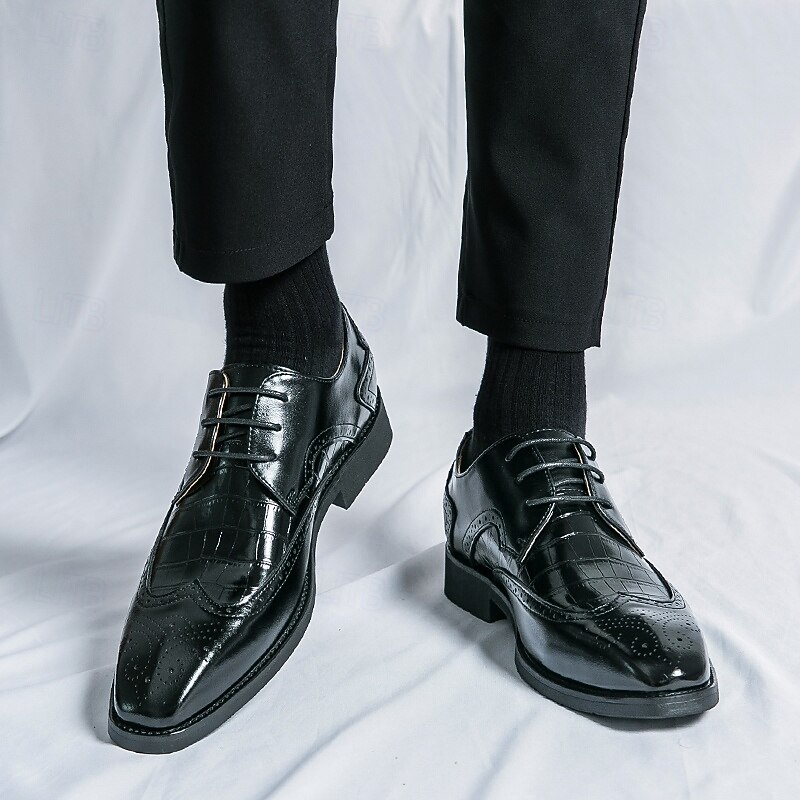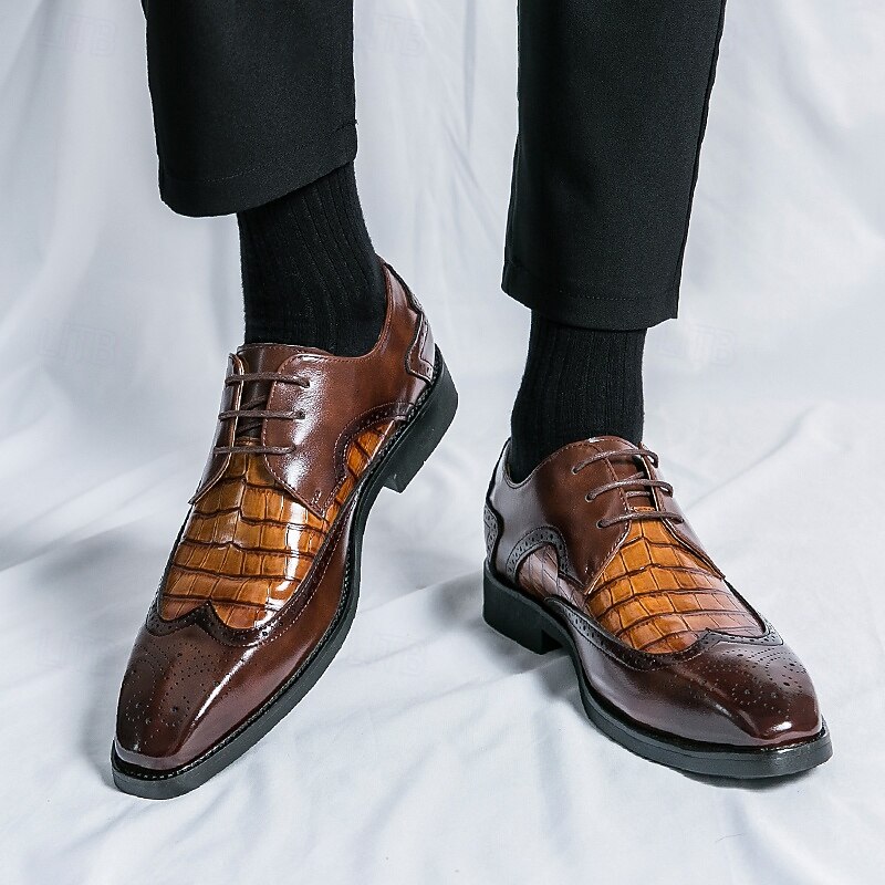 HOT ! Men's Brown Faux Leather Oxford Shoes with Crocodile Pattern and Brogue Detailing – Elegant Dress Shoes for Formal Events and Office Wear