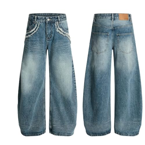 HOT ! Mens Y2K Skater Wide Leg Jeans Zipper Frayed Pockets Fashion Blue Baggy Trousers