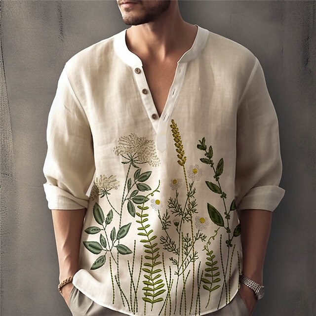 Highlights Delighted to present our exclusive Fayetteville AR men's linen shirt featuring a floral graphic print in partnership with The Laundry Room This chic washable shirt showcases autumn-designed polyester and linen fabric thoughtfully imprinted The stand collar long sleeves and regular fit add to its unique style Each piece is made to be distinctive just like you
