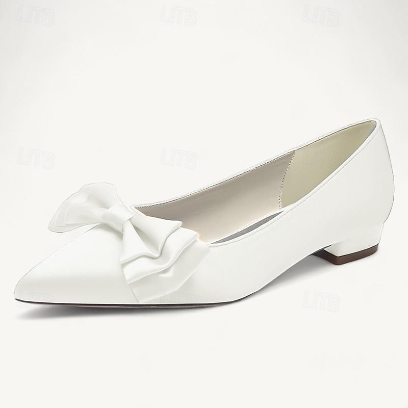 Women's Wedding Shoes Flats Party Bowknot Low Heel Pointed Toe Elegant Satin Black White Ivory 20