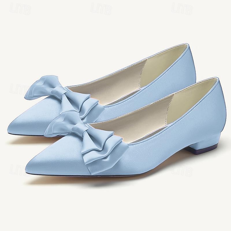 Highlights [Fabric] : Crafted from elegant satin, these women's shoes provide a luxurious and sleek appearance with a durable and glossy finish. The satin material adds a sophisticated touch, perfect for a polished and refined look at any event. [Style] : Designed with a classic pointed toe, these flats feature a low heel for a comfortable and elegant silhouette. The modest heel height provides subtle elevation while ensuring stability throughout the day or night. [Design Highlights] : Adorned with a delicate bowknot on the front, these shoes offer a charming and feminine detail, elevating their appeal. The light blue color variant adds a touch of uniqueness and elegance, suitable for those looking for a distinct addition to their wardrobe. [Occasions] : Perfect for weddings, parties, and other special occasions, these shoes transition seamlessly from day to night. Their versatile design allows them to pair beautifully with both casual and formal outfits, making them an essential addition to any wardrobe. [Size Range] : Available in a wide range of sizes from US5 / EU35 / UK3 to US13 / EU43 / UK11, ensuring a suitable fit for various foot sizes.