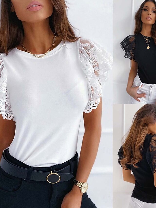Women's Lace Splicing Top Sexy Sleeveless Crew Neck Regular Tops off white Black Summer Spring 6