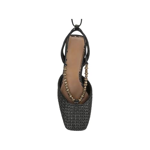 Raffia Ballet Sandals for Women Lace up Ankle Straps Flats Closed Square Toe Maryjane Dressy Casual Beaded Shoes 6