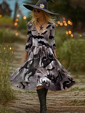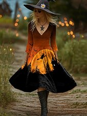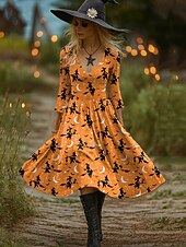 More information about Halloween Women's Witch Print Midi Dress A Line Dress Vacation Casual Party Regular Fit Graphic Hocus Pocus Long Sleeve V Neck Orange Dark Grey Light Orange Spring Fall