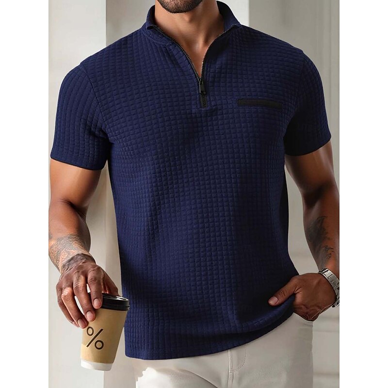 HOT ! Men's Waffle Polo Shirts Zip Polo Casual Holiday Quarter Zip Short Sleeve Fashion Basic Plain Quarter Zip Summer Spring All Seasons Slim Fit Black White Navy Blue Orange Waffle Polo Shirts