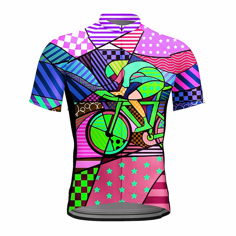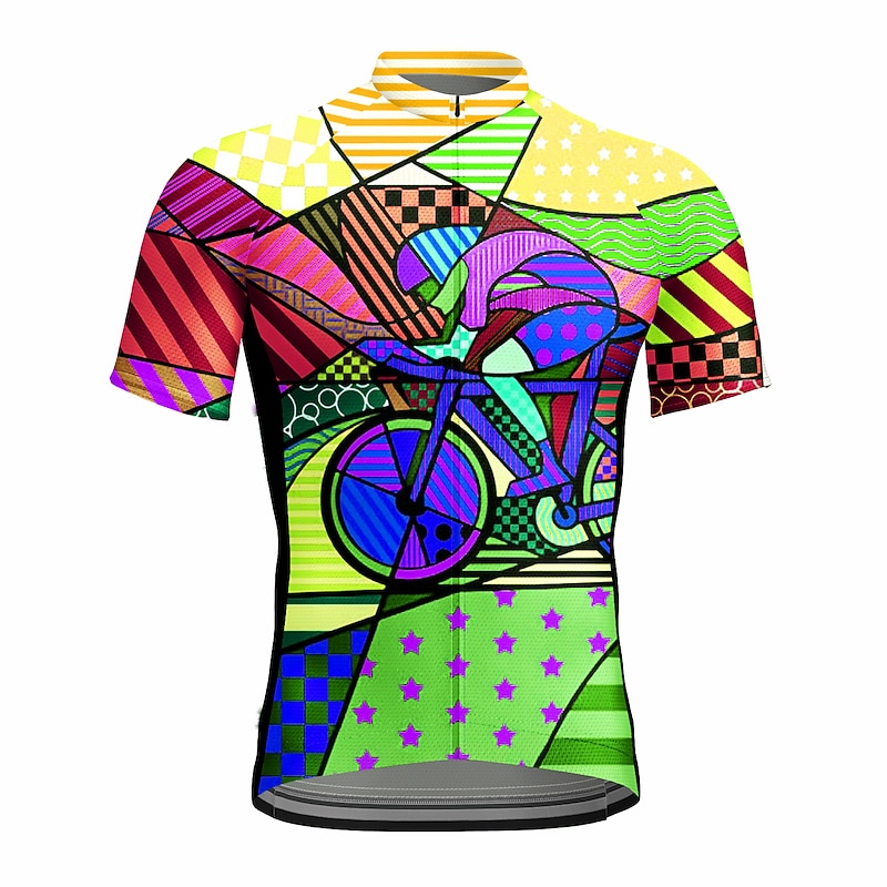 Highlights - Made of 100% polyester, this cycling shirt is lightweight and offers superb wicking and breathability. - The thin materials move sweat away from your body, leaving you dry and comfortable even during intense cycling. - With three rear pockets and a zippered security pocket in the front, you can store all the essentials you need for a mid-ride break. - The loose fit and longer elastic rear hem provide supreme comfort on and off the bike. - The reflective strips on the front and back improve visibility during poor light conditions, keeping you safe day and night. - Ideal for both road and mountain biking, this cycling jersey features a classic design that looks good even off the bike. - Available in a fun rainbow and stars pattern. - Made with spandex for added flexibility. - Designed for men's fit. - Perfect for athleisure wear, with quick dry and moisture wicking properties that keep you comfortable during any activity.