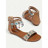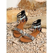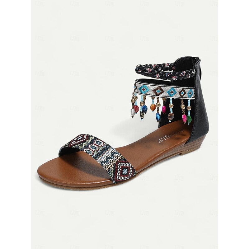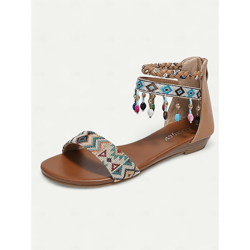 HOT ! Women's Bohemian Beaded Ankle Strap Sandals – Tribal Print Flat Summer Shoes for Casual Beach Outings